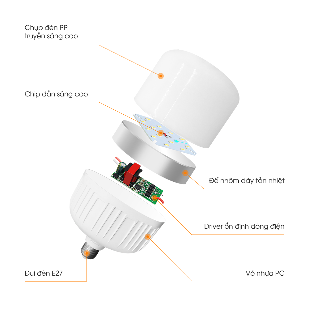 - Bóng đèn được thiết kế hình trụ cho độ tỏa sáng rộng